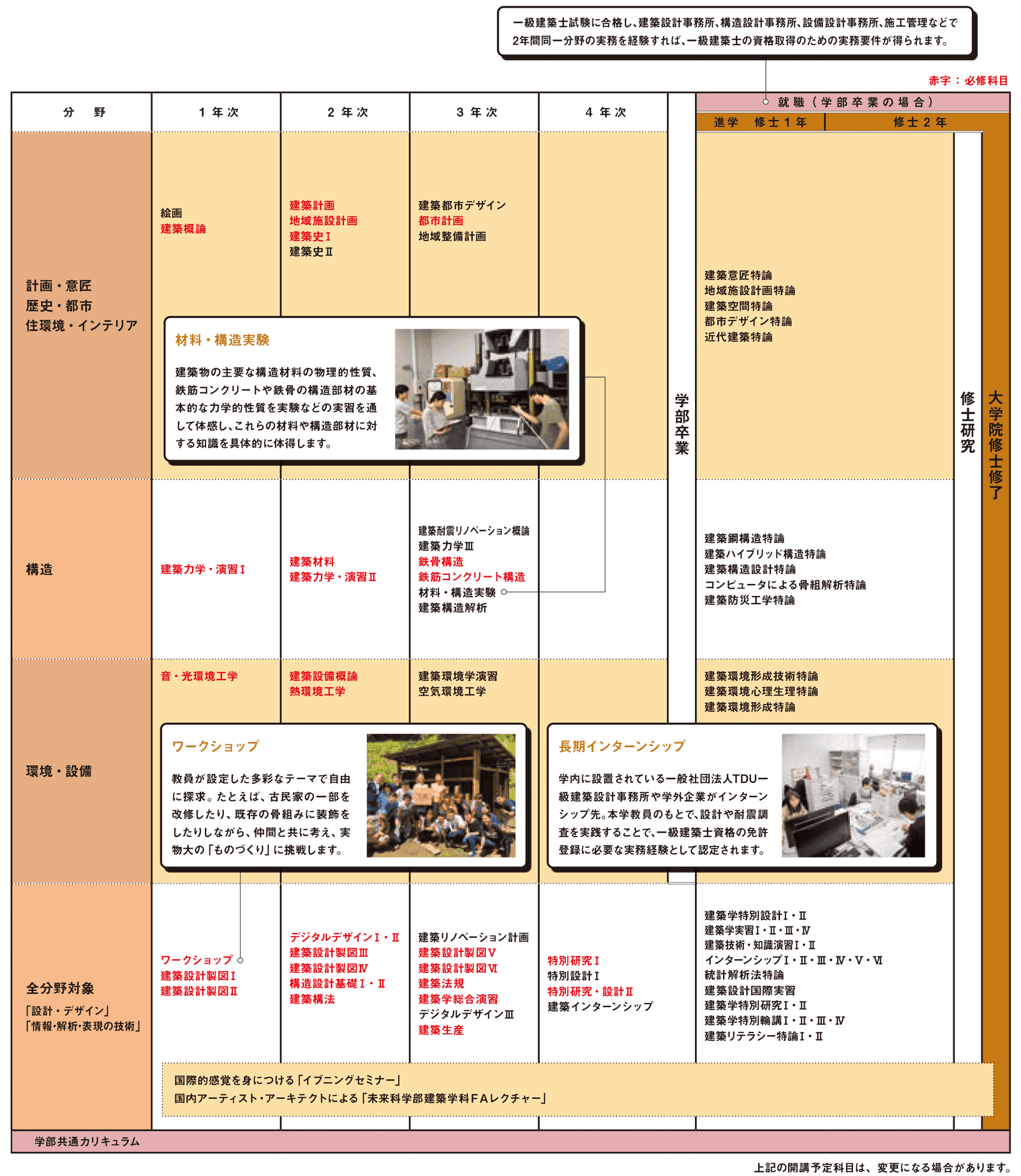 建築学科では下記のようなカリキュラム(下の表)で勉強していきます。